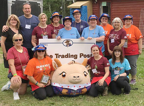 "Mosaic mascot 'Aurora' poses with the Zone West staff and Guiding volunteers outside the Trading Post at Camp Woods, Sylvan Lake. I'm in the back row, 4th from the left." -- Lori St. Martin